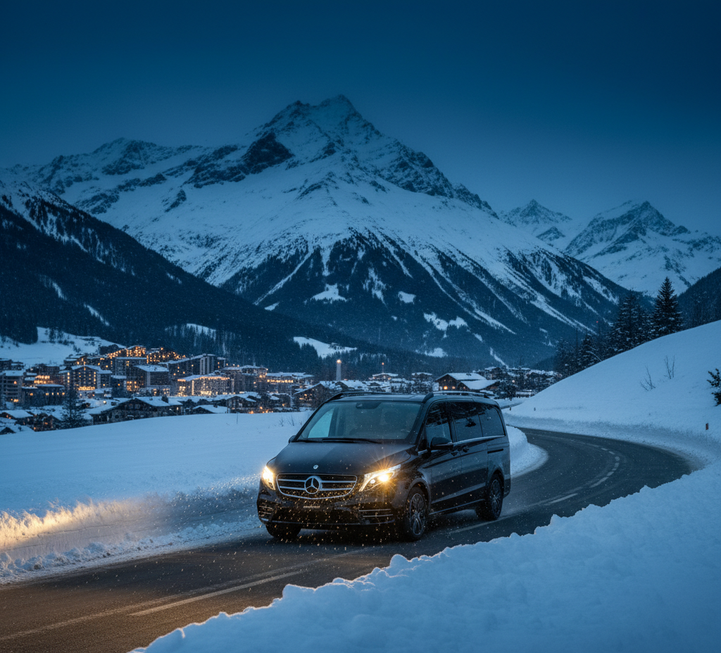 Door-to-door private chauffeur to Davos, St. Moritz, Zermatt, Gstaad, Verbier and every major Swiss ski resort — AWD Mercedes fleet, winter tyres, full ski equipment space.
